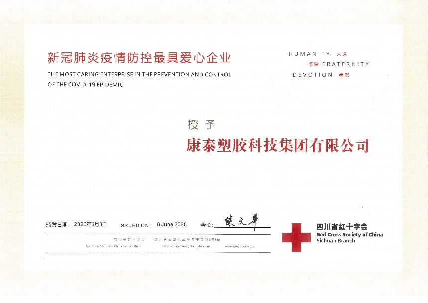 2020.11康泰集團(tuán)榮獲四川省“新冠肺炎疫情防控最具愛心企業(yè)”稱號(hào)近日,為表彰康泰塑膠科技集團(tuán)在新冠疫情防控工作中的突出貢獻(xiàn),四川省紅十字會(huì)授予集團(tuán)“新冠肺炎疫情防控最具愛心企業(yè)”榮譽(yù)稱號(hào)。2020年1月,正當(dāng)全國(guó)人民喜迎新春佳節(jié)時(shí),一場(chǎng)突如其來的新型冠狀病毒肺炎疫情肆虐中華大地。面對(duì)新型冠狀病...閱讀人數(shù):7698 -